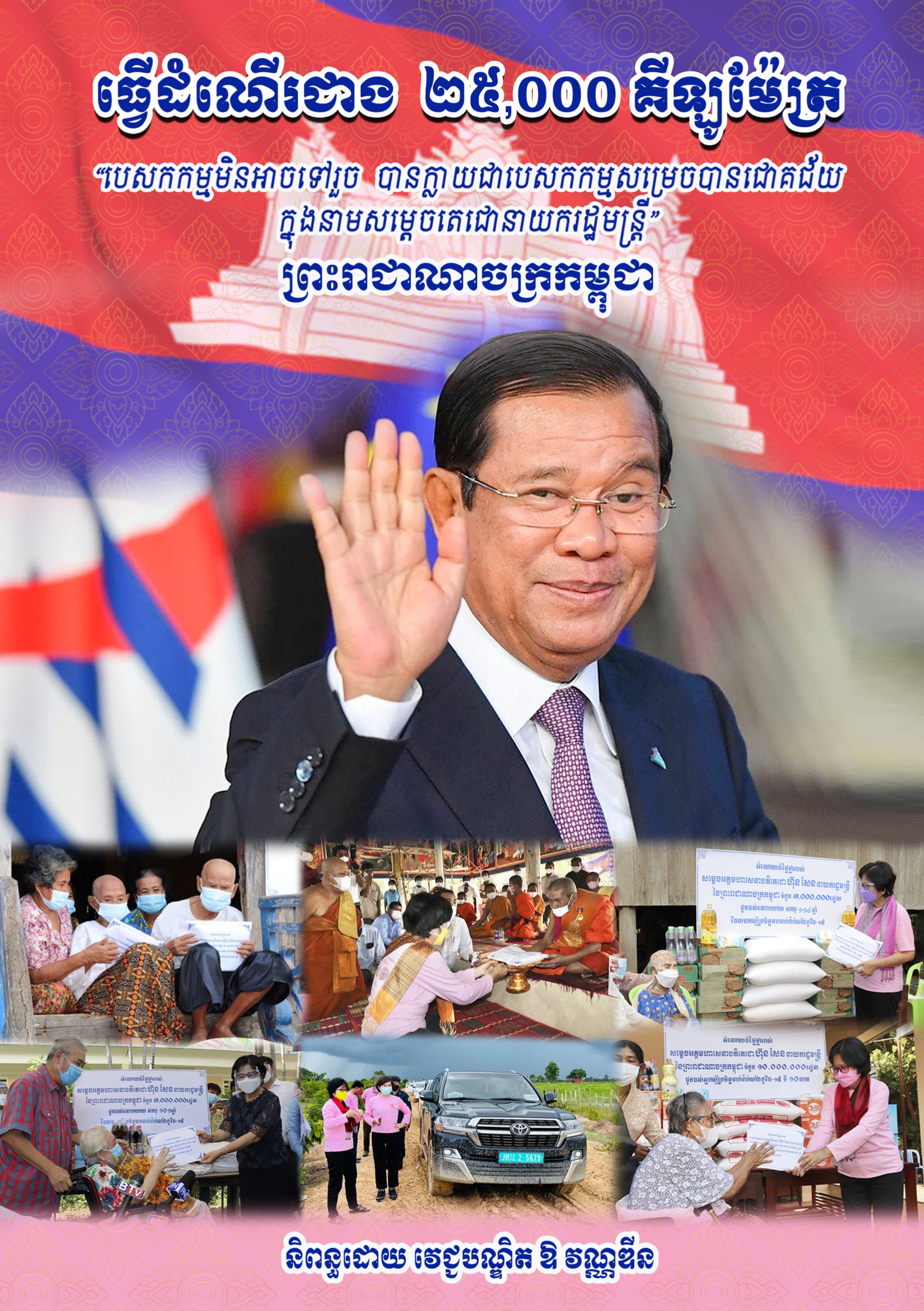 2. The book “25,000 travelled Impossible Mission Became Mission Successfully Accomplished on behalf of Samdech Prime Minister” (published in April 2022 in Khmer and English languages) documents a humanitarian mission to recognise the one-million milestone and the centenarian vaccinated persons during the implementation of the “Blossom Strategy” to roll out the COVID-19 vaccine nationwide in Cambodia. This strategy was initiated by the Samdech Techo Prime Minister at that time to care for and support people, especially older centenarian persons who volunteered for the COVID-19 vaccination, so-called “On-Million Milestone COVID-19 Vaccination Award” (comprised of a 10-million-riel award together with selected food and grocery items) and a “Respectful Centenarian Award” (3-million-riel gift together with selected food and grocery items).